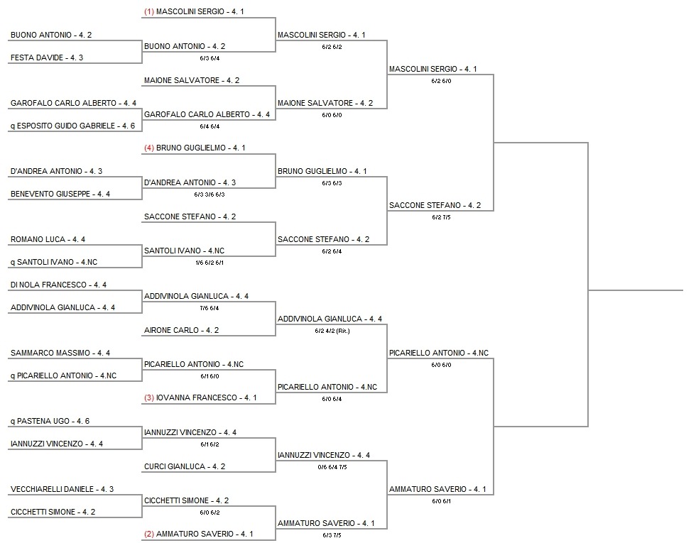 I match che hanno calamitato maggiormente l’attenzione sono stati i quarti della parte bassa del tabellone. E’ stata una giornata di festa per i due giovani istruttori Antonio Picariello e Saverio Ammaturo. Entrambi cresciuti sotto la guida del maestro Picardi, oggi studenti di Scienze motorie, hanno già fatto una precisa scelta di vita, ma vogliono regalarsi soddisfazioni anche sul campo. Due match senza storia per loro: 6/0, 6/0 in favore di Picariello, 6/0, 6/1 in favore di Ammaturo rispettivamente contro i 4.4 Addivinola e Iannuzzi.